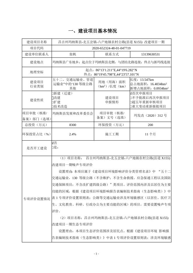 昌吉州玛纳斯县-北五岔镇-六户地镇农村公路(县道X155) 改建项目一期环境影响报告表.doc
