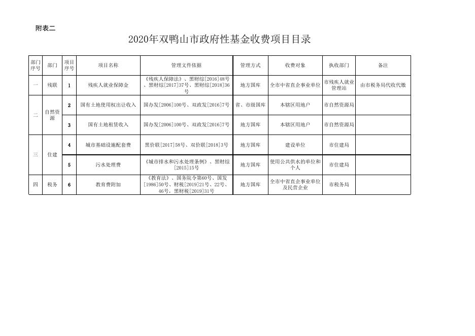 2020年双鸭山市政府性基金收费项目目录.xls