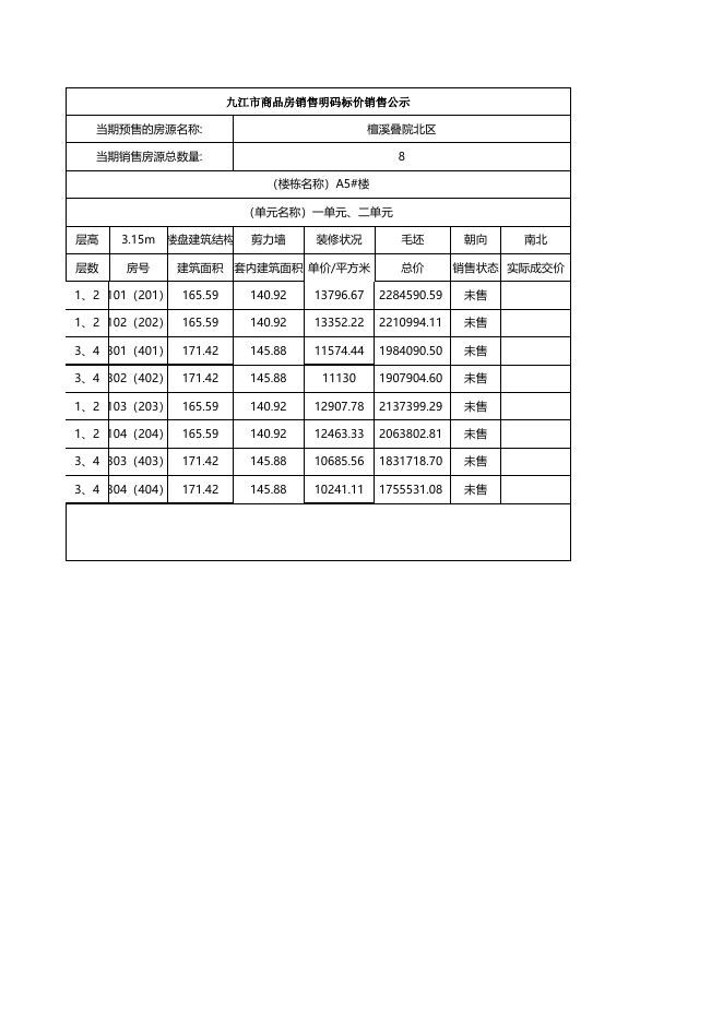 九江市商品房销售明码标价销售公示、楼盘公示(檀溪叠院北区A5#).xlsx