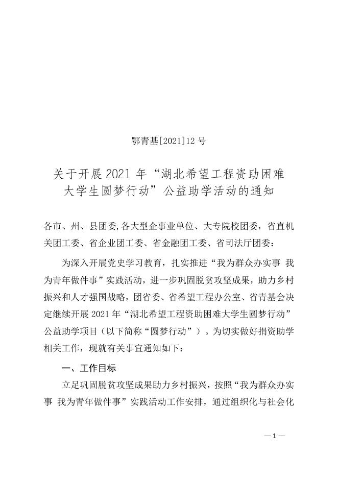关于开展2021年 “湖北希望工程资助困难大学生圆梦行动”公益活动的通知.doc