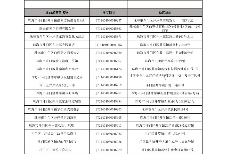 斗门区食品经营单位2017年10月13日至10月19日发证公示名单.xls