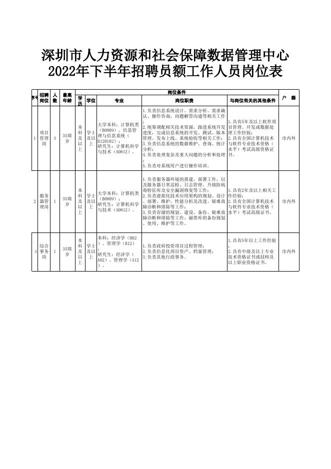 附件1:深圳市人力资源和社会保障数据管理中心2022年下半年招聘员额工作人员岗位表.xls