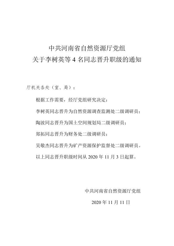 中共河南省自然资源厅党组关于李树英等4名同志晋升职级的通知.docx