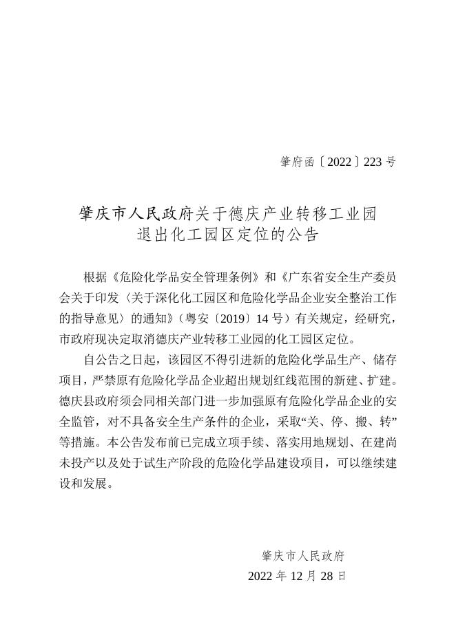 肇庆市人民政府关于德庆产业转移工业园退出化工园区定位的公告.doc