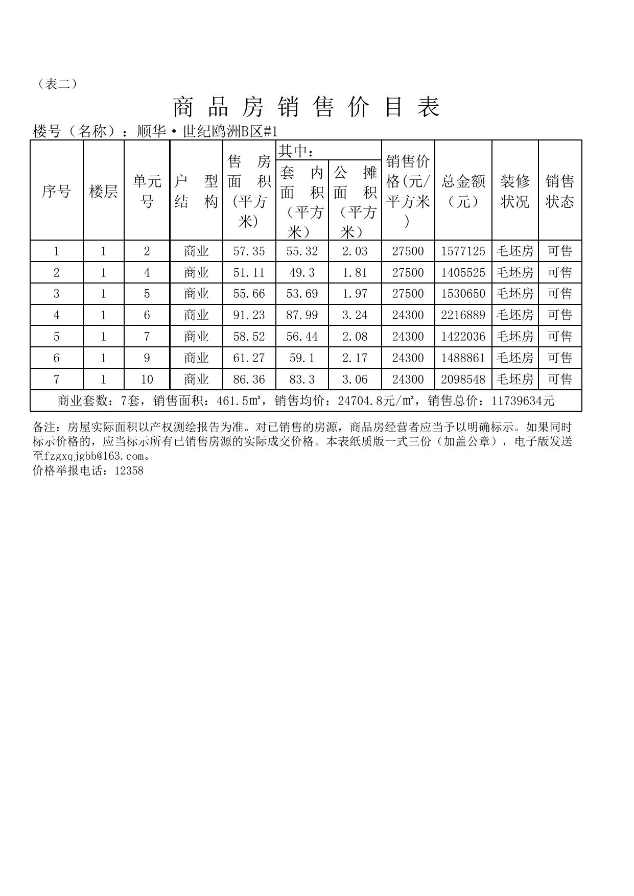 顺华·世纪鸥洲B区1#楼商品房销售价目表(商业).xlsx