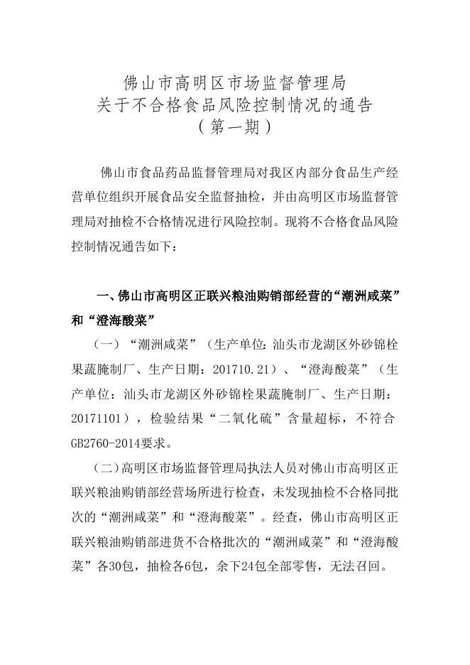 佛山市高明区市场监督管理局关于不合格食品风险控制情况的通告(第一期).doc