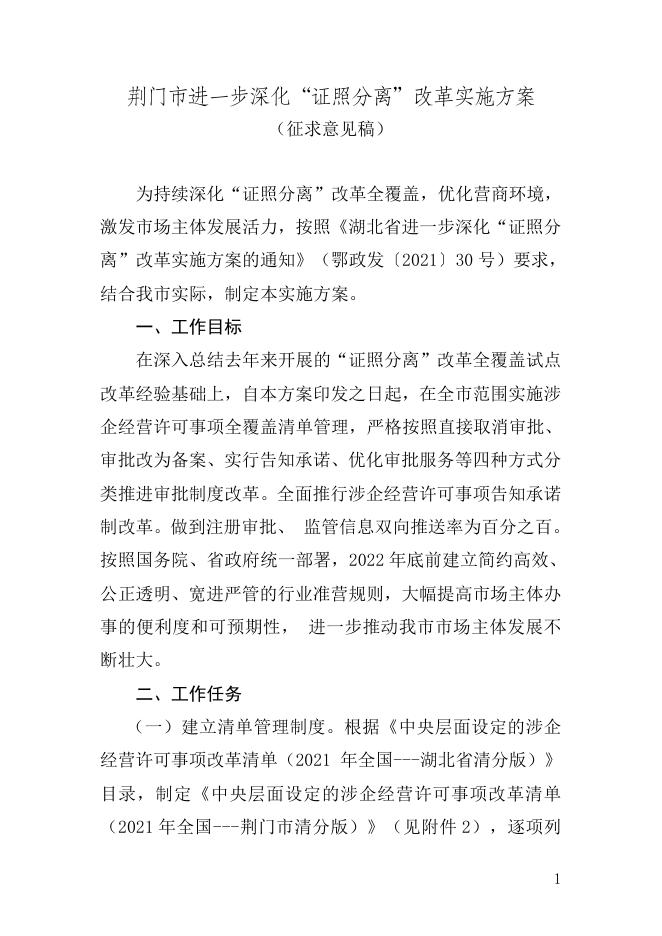 荆门市进一步深化“证照分离”改革实施方案(征求意见稿).doc