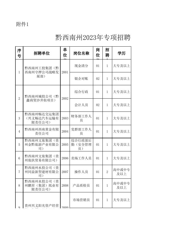 附件1:黔西南州2023年专项招聘国有企业工作人员岗位一览表.xlsx