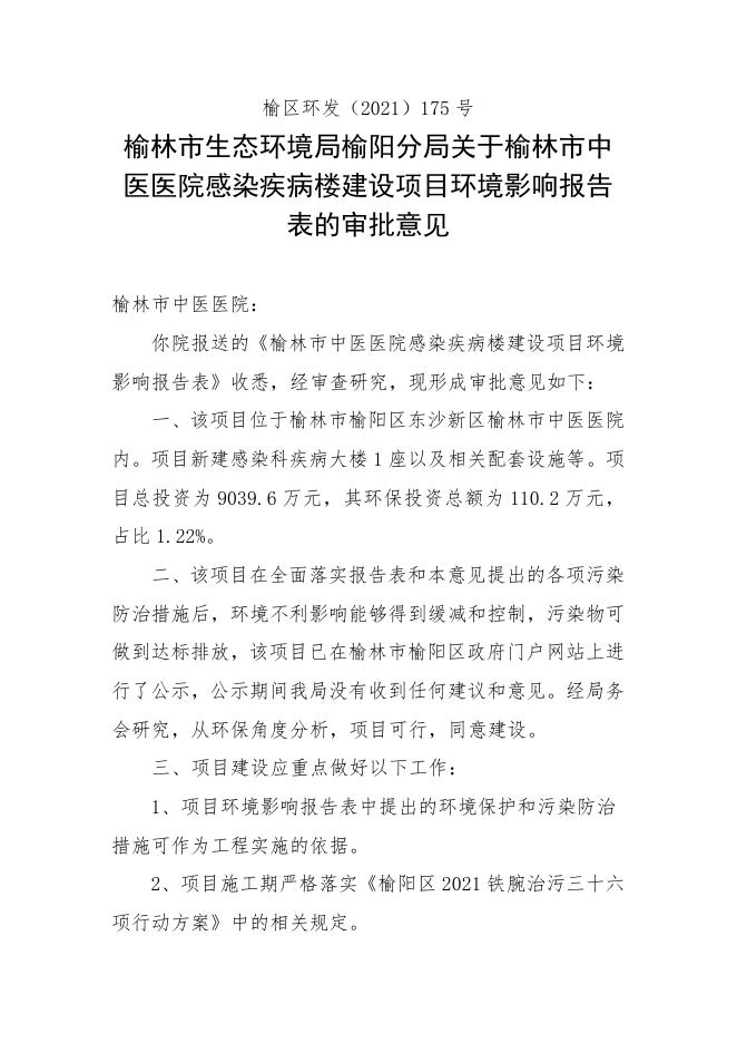 2020.8.12榆林市生态环境局榆阳分局关于榆林市中医医院感染疾病楼建设项目环境影响报告表的审批意见.docx