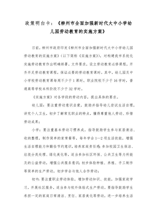 政策明白卡:《柳州市全面加强新时代大中小学幼儿园劳动教育的实施方案》.docx