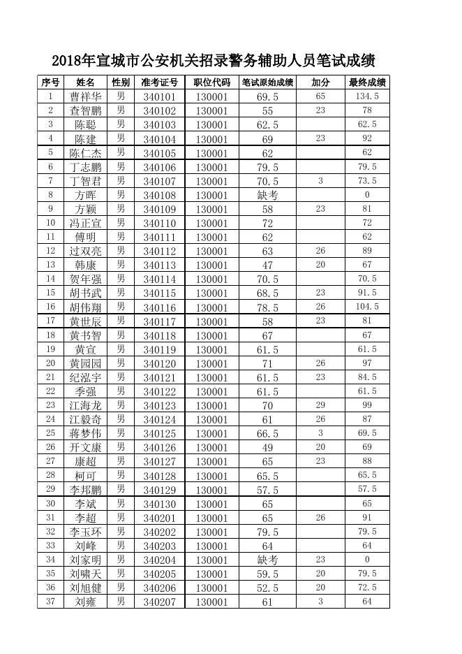 2018年宣城市公安机关招录警务辅助人员笔试成绩.xls