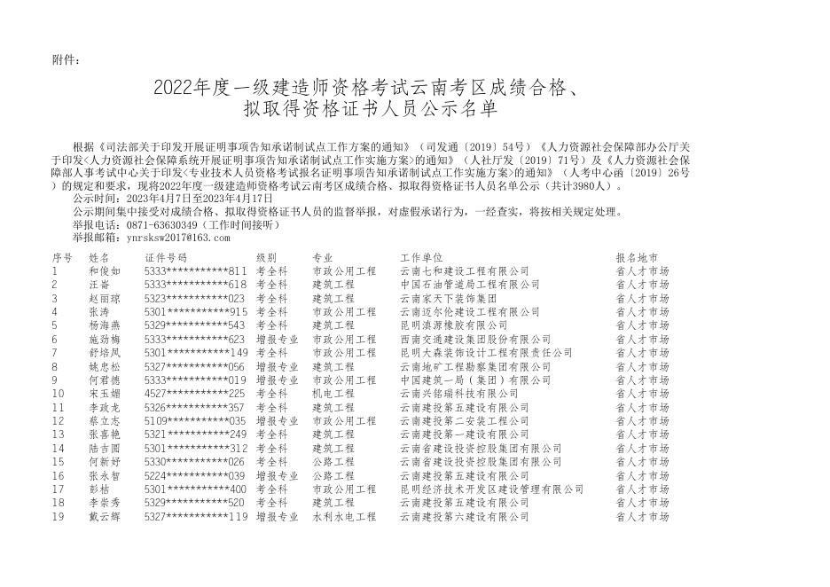 附件:2022年度一级建造师资格考试云南考区成绩合格、拟取得资格证书人员公示名单.xls
