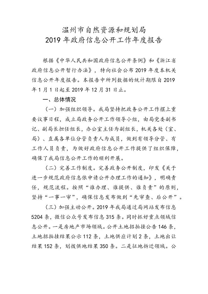 温州市自然资源和规划局2019政府信息公开工作年度报告.docx