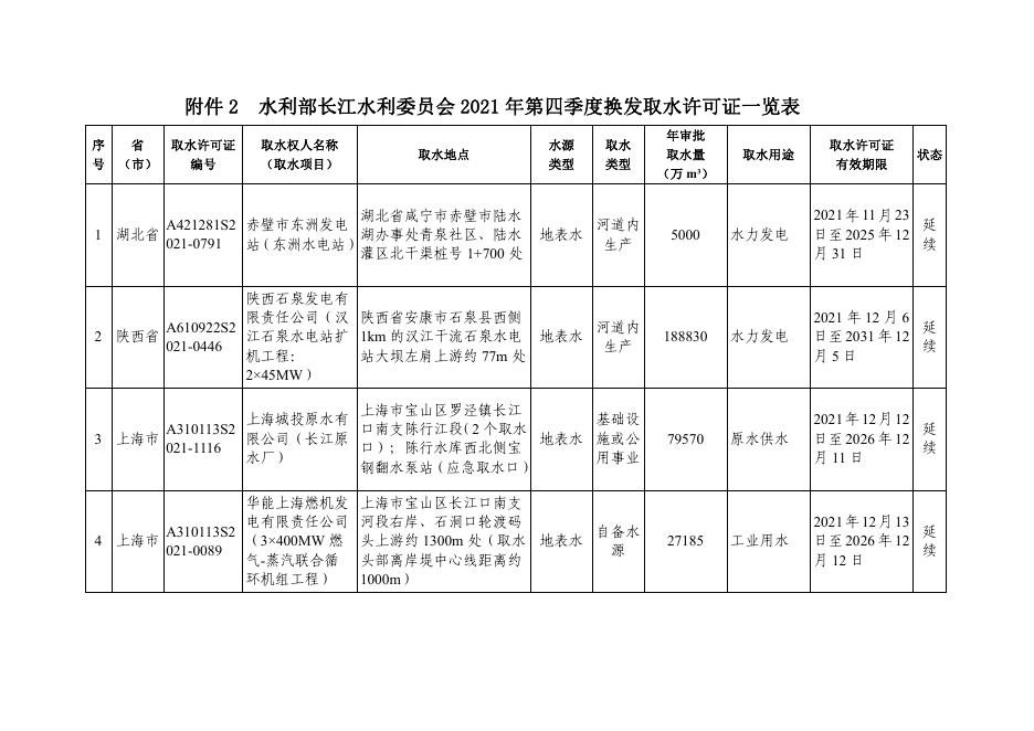 附件2.:水利部长江水利委员会2021年第四季度换发取水许可证一览表.pdf