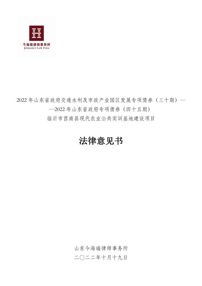 2022年山东省政府交通水利及市政产业园区发展专项债券(三十期)—— 2022年山东省政府专项债券(四十五期) 临沂市莒南县现代农业公共实训基地建设项目 法律意见书.pdf