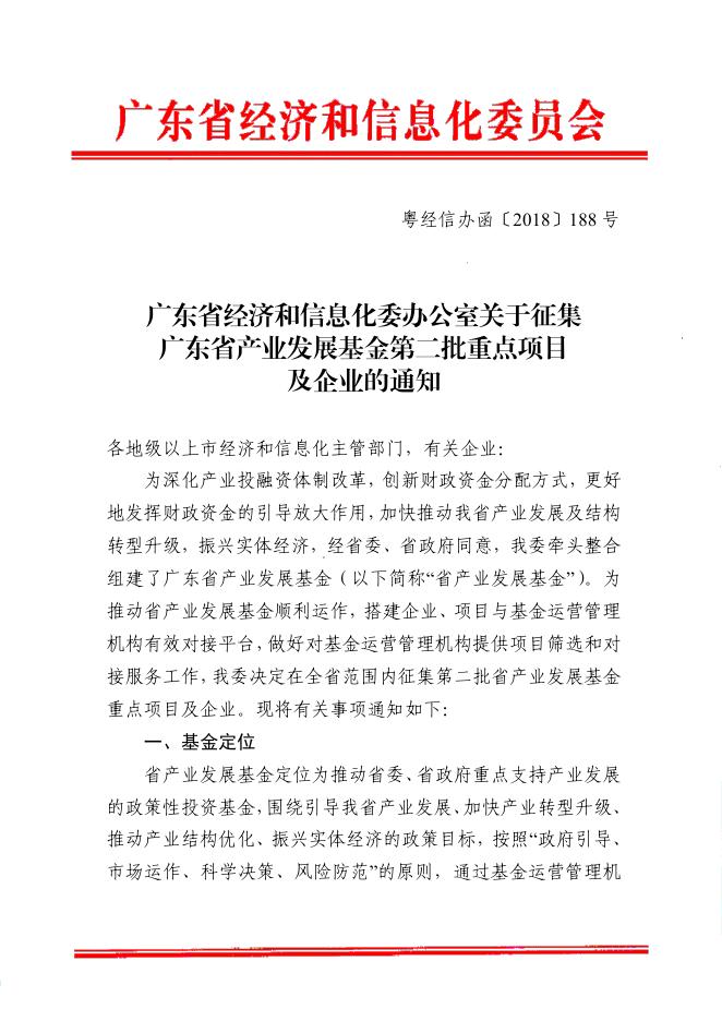 粤经信办函[2018]188号:广东省经济和信息化委办公室关于征集广东省产业发展基金第二批重点项目及企业的通知.pdf