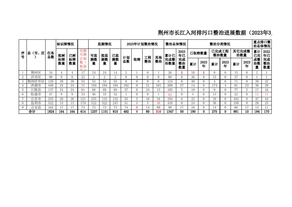 荆州市长江入河排污口整治进展数据(2023年3月).xlsx