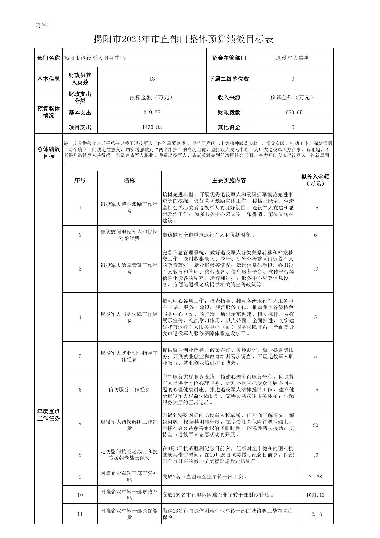 揭阳市退役军人服务中心2023年市直部门整体预算绩效目标表.pdf