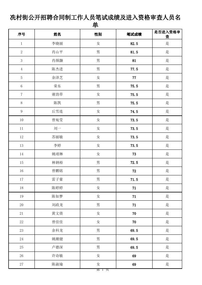 附件1:冼村街公开招聘合同制工作人员笔试成绩及进入资格审查人员名单.xls