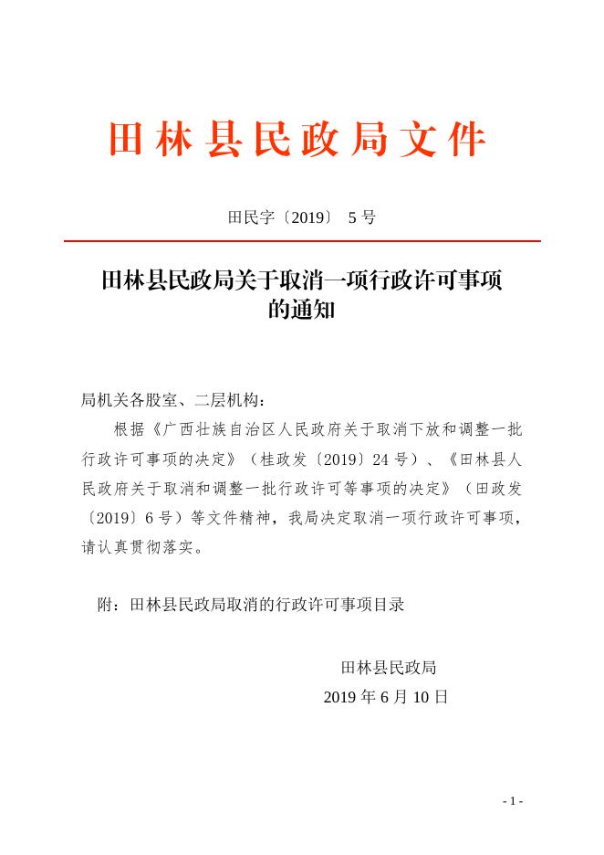 田民字〔2019〕 5号田林县民政局关于取消一项行政许可事项的通知.doc