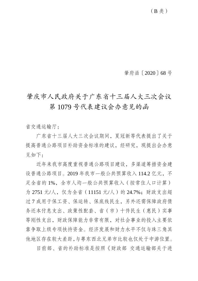 肇庆市人民政府关于广东省十三届人大三次会议第1079号代表建议会办意见的函.doc
