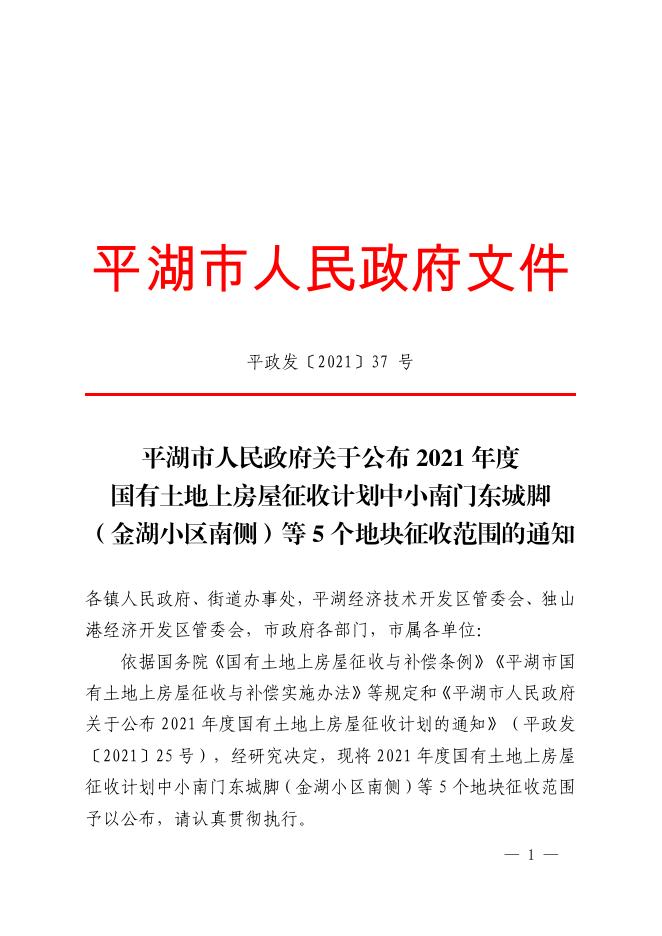 平政发(2021)37号【公布2021年度国有土地上房屋征收计划中小南门东城脚(金湖小区南侧)等5个地块征收范围】.pdf