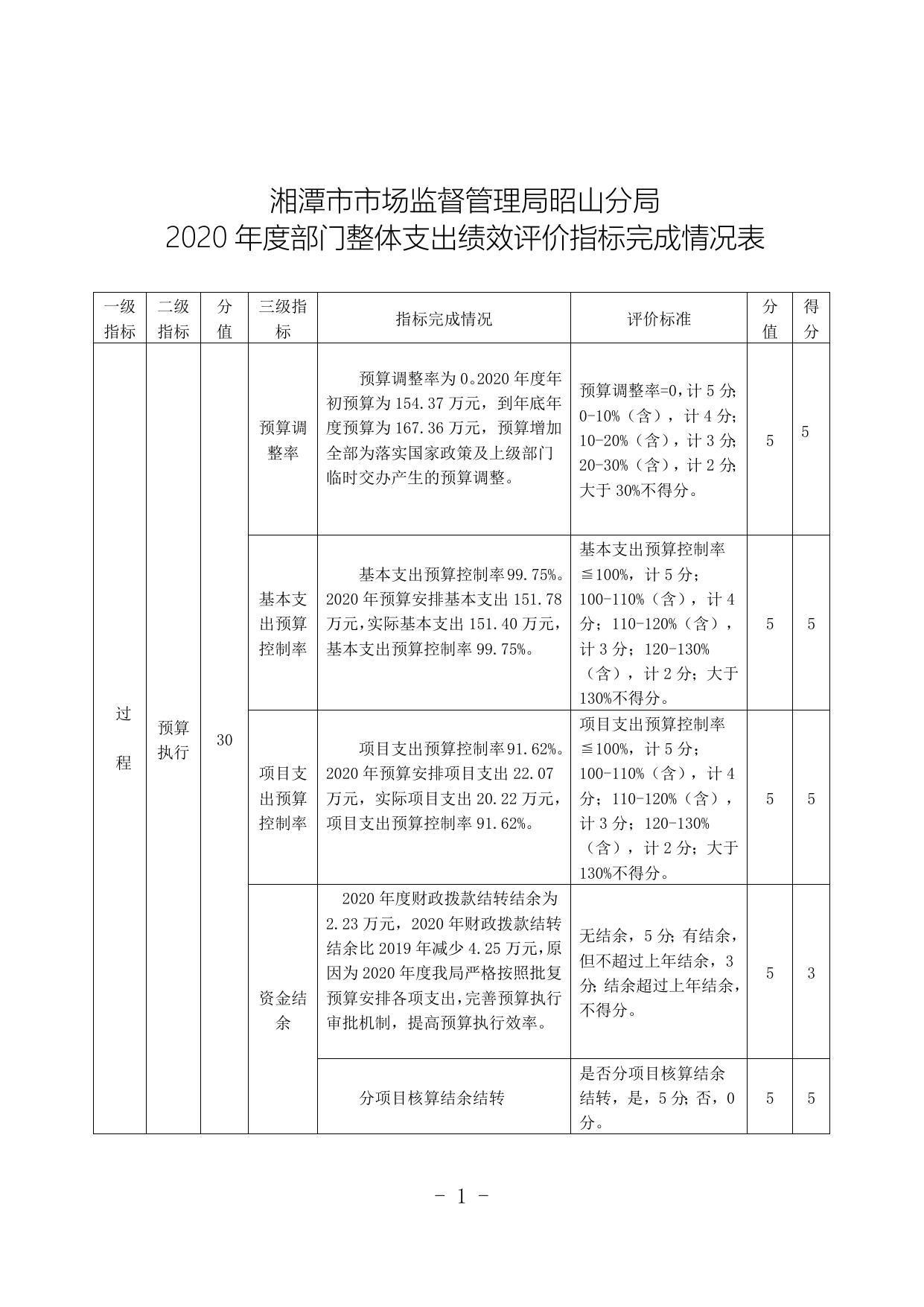 湘潭市市场监督管理局昭山分局2020年度部门整体支出指标完成情况表.doc