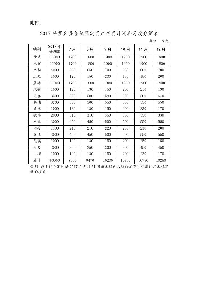 2017年紫金县各镇固定资产投资计划和月度分解表.doc