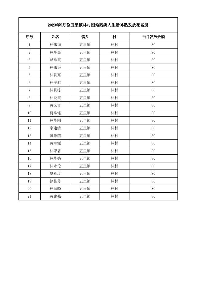 2023年5月份五里镇林村困难残疾人生活补贴发放花名册.xlsx