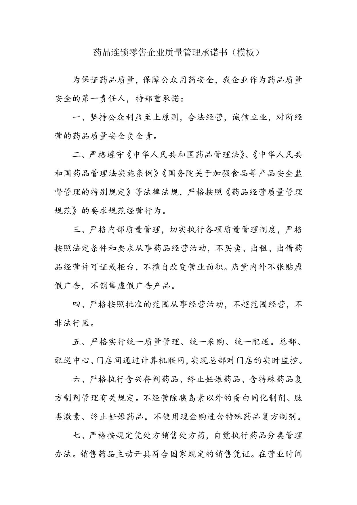 药品连锁零售企业质量管理承诺书(模板).doc
