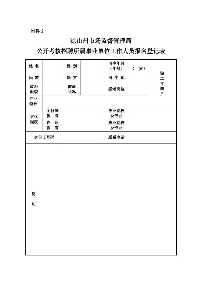 附件2:凉山州市场监督管理局公开考核招聘所属事业单位工作人员报名登记表.doc