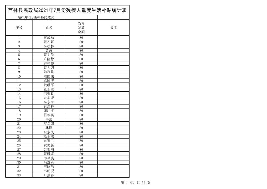 西林县民政局2021年7月份残疾人重度生活补贴统计表.xlsx