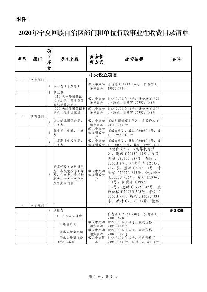 2020年宁夏回族自治区部门和单位行政事业性收费目录清单.pdf
