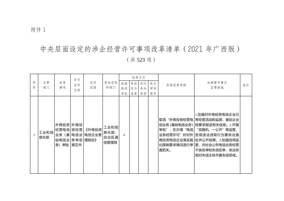 附件1 中央层面设定的涉企经营许可事项改革清单(2021年广西版).doc