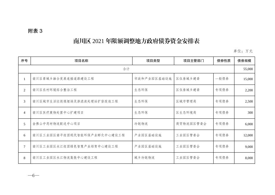 附表3:南川区2021年限额调整地方政府债券资金安排表.pdf