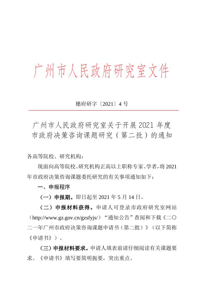 广州市人民政府研究室关于开展2021年度决策咨询课题研究(第二批)的通知(穗府研字【2021】4号).doc