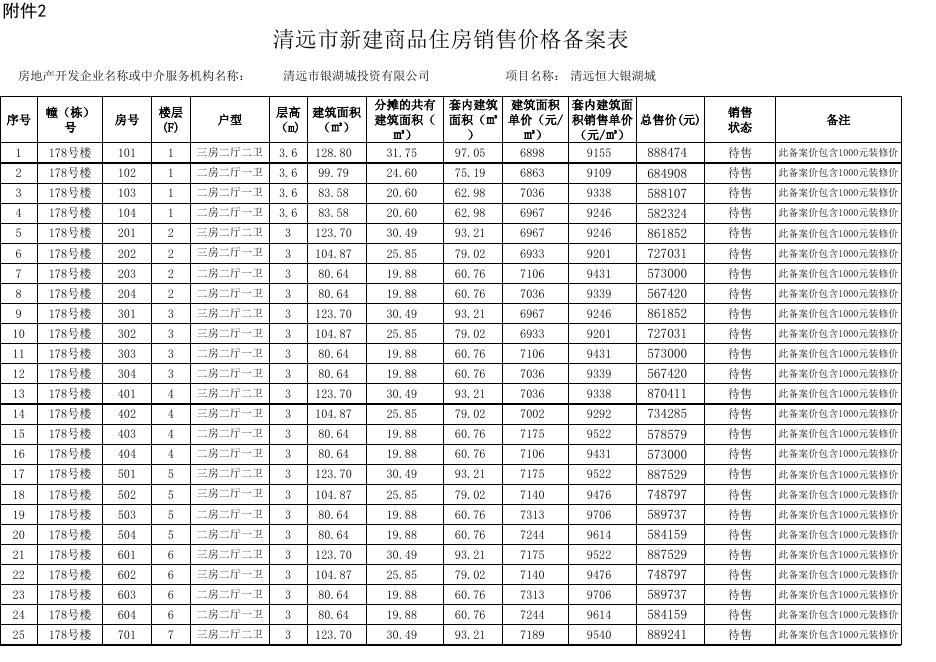恒大银湖城178号楼新建商品住房销售价格备案表.xls