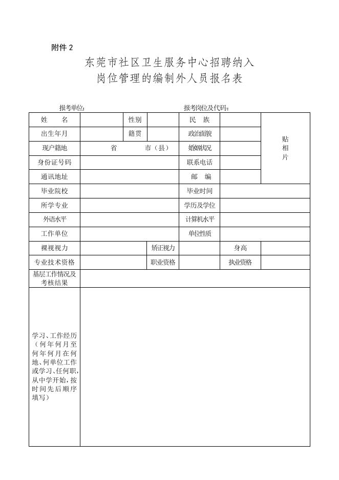 附件2 东莞市社区卫生服务中心招聘纳入岗位管理的编外人员报名表.docx