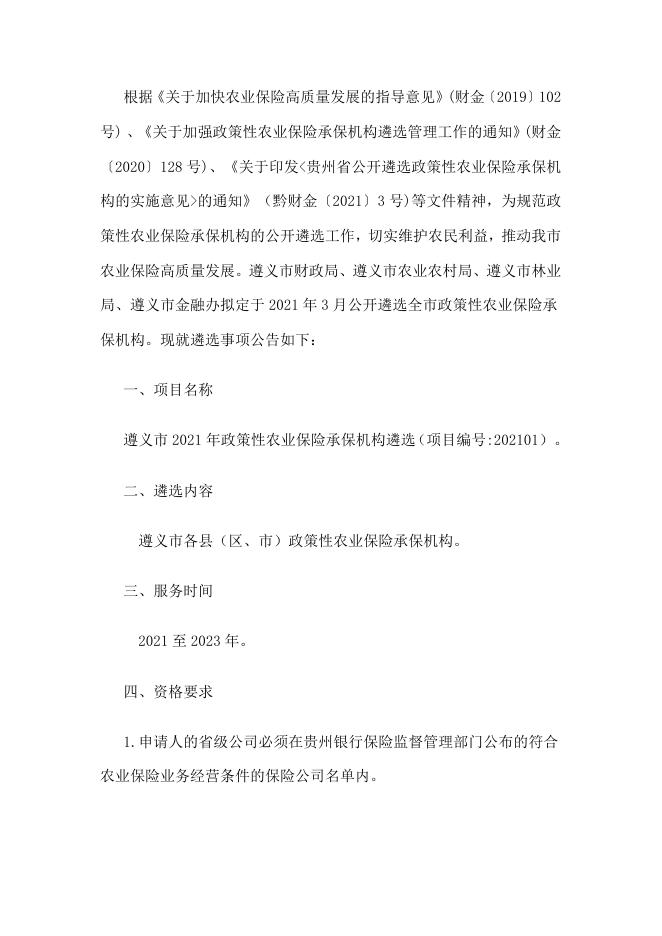 遵义市2021年政策性农业保险承保机构公开遴选公告.docx