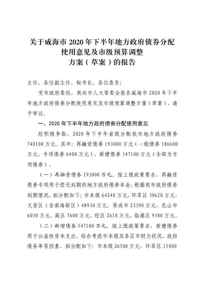 威海市2020年下半年地方政府债券分配使用意见及市级预算调整报告(政府预算第二次调整).pdf