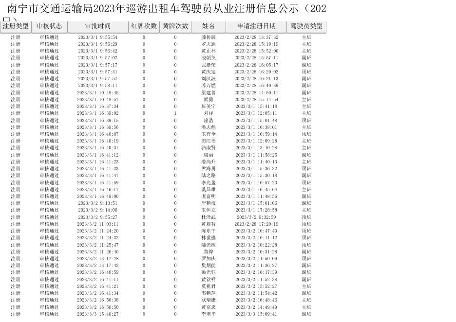 南宁市交通运输局2023年巡游出租车驾驶员从业注册信息公示(2023年3月1日至2023年3月15日).xls
