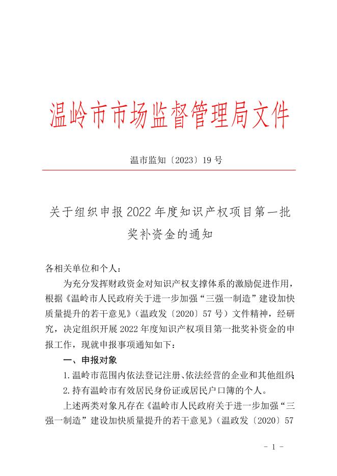 温市监知〔2023〕19号申报(2022年度知识产权项目第一批补助).doc