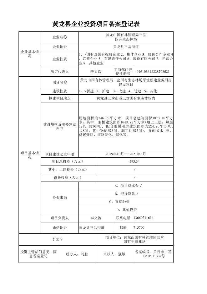 黄龙县国有林管理局三岔国有生态林场原址新建业务用房建设项目备案确认书的批复.xls