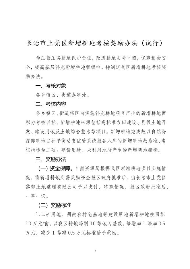 长治市上党区新增耕地考核奖励办法 (试行).docx