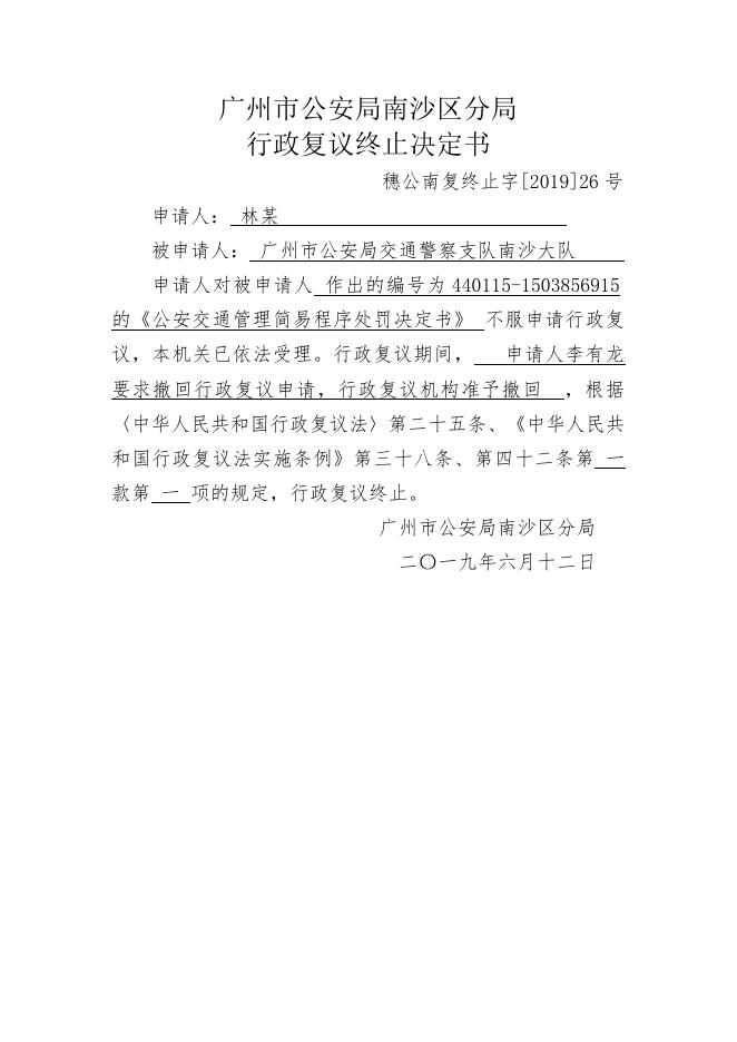 2019-05-05申请人林某不服广州市公安局交警支队南沙大队行政处罚一案行政复议终止决定书.doc