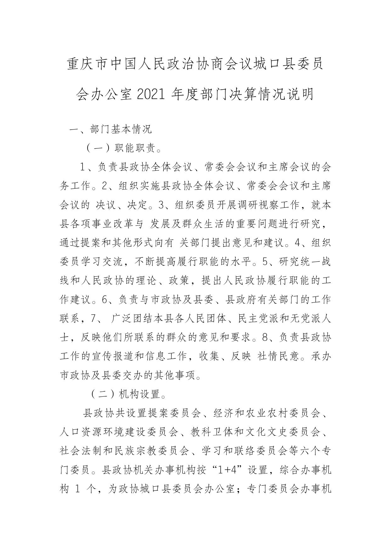 重庆市中国人民政治协商会议城口县委员会办公室2021年度部门决算情况说明.doc