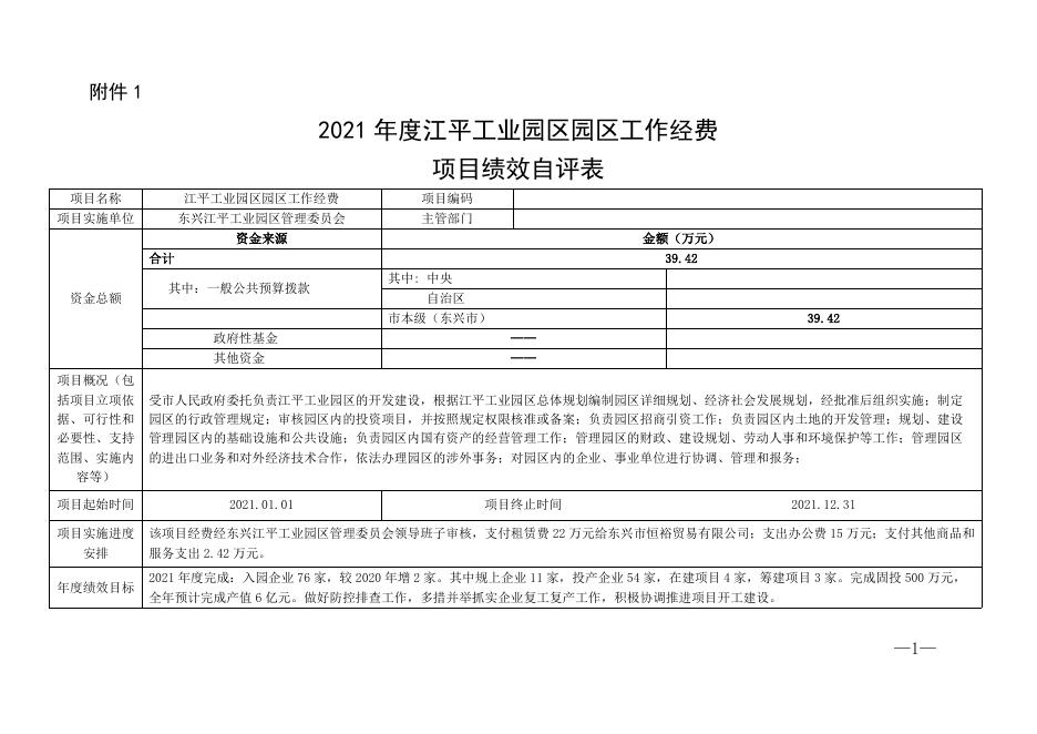 附件1:东兴江平工业园区管理委员会园区工作经费支出绩效自评表.docx