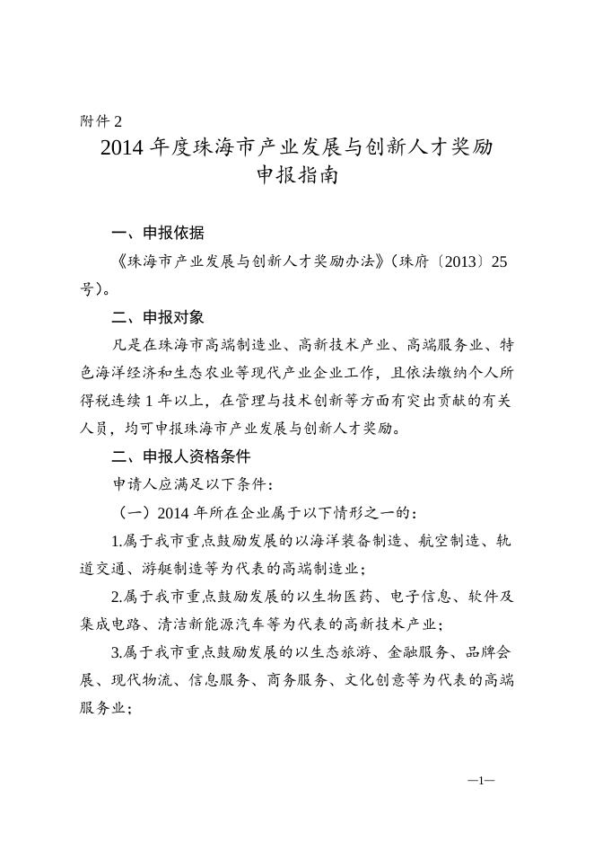 附件2:2014年度珠海市产业发展与创新人才奖励申报指南.doc