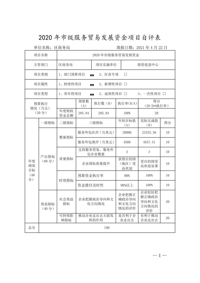12---【市财政局、市商务局拨付2020年市级服务贸易发展资金的通知】项目自评表.doc