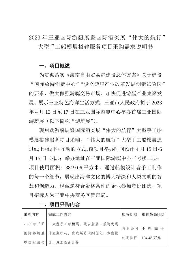 附件:2023年三亚国际游艇展暨国际酒类展“伟大的航行”大型手工船模展搭建服务项目采购需求说明书.docx